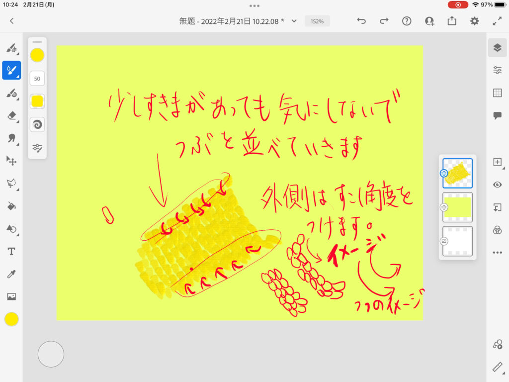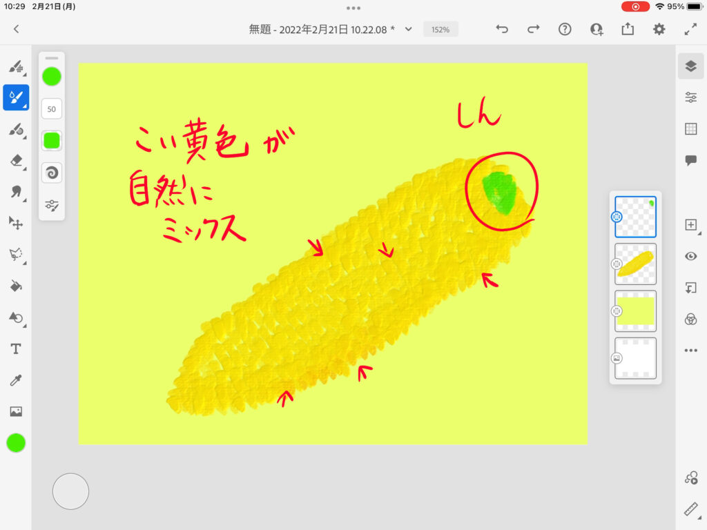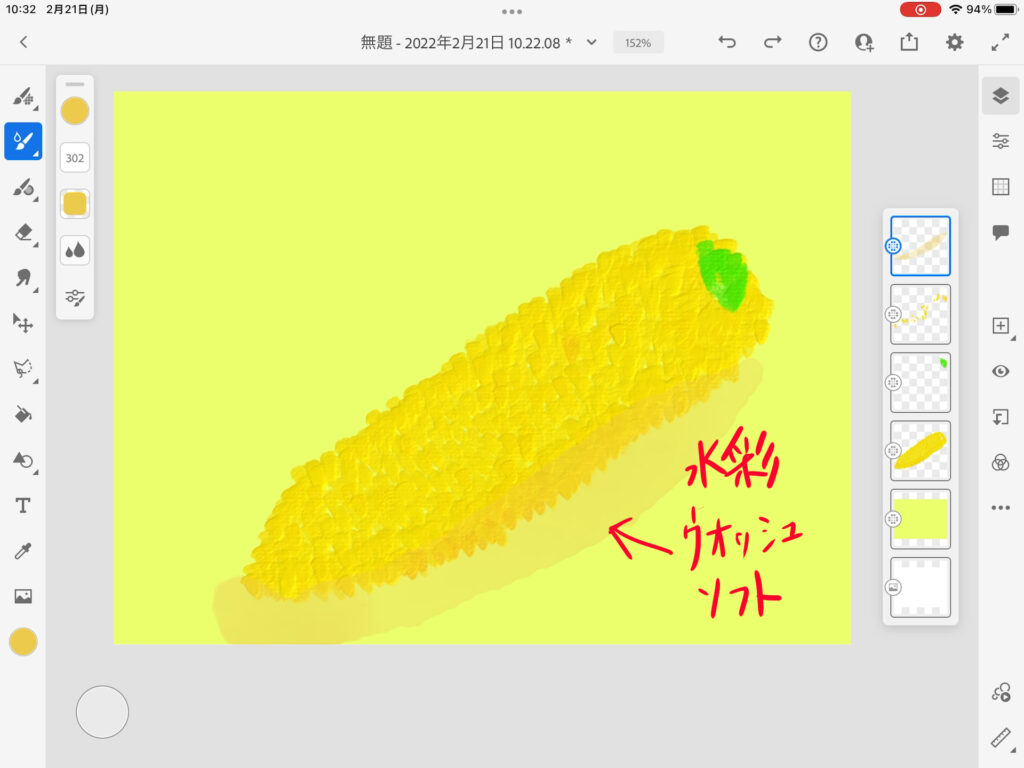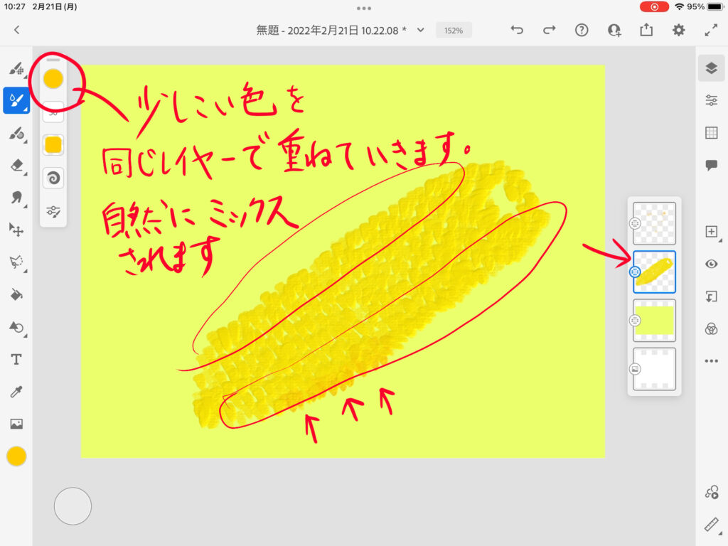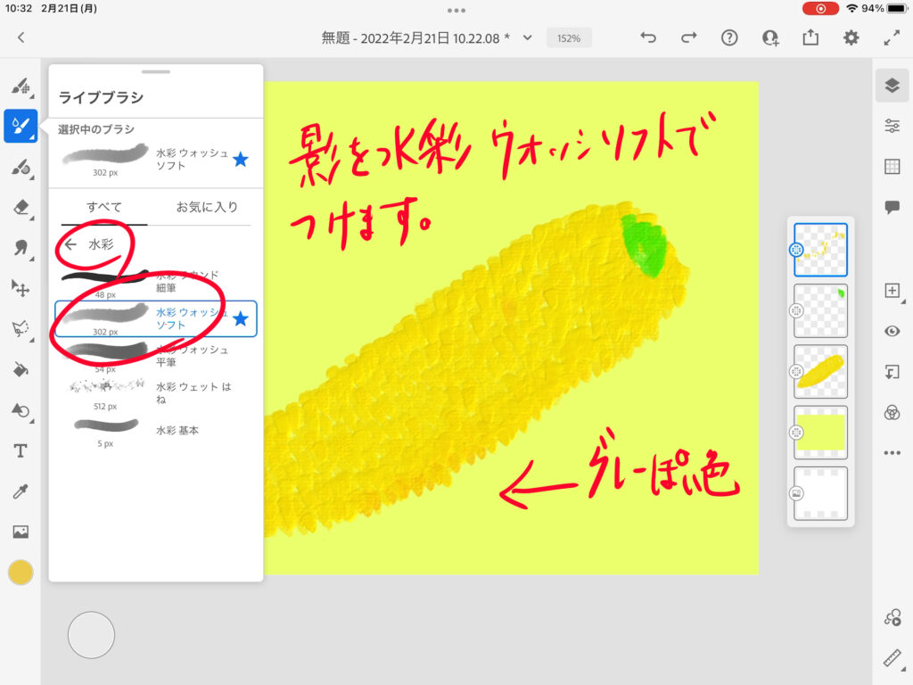 油彩 iPadアイパッドフレスコ絵手紙絵の描き方トウモロコシ こうばしいとうもろこし 2022年2月21日 2022年4月2日 pandasan 北海道夏といえば 焼きトウモロコシ アイパッドでは、油彩と水彩のコンビネーションもできます。 物は油彩でしっかり描いて、影のグレー部分を水彩ウオッシュソフトで 描く方法です。 全部水彩で描くとインパクトがなくなると思われるときに便利です。